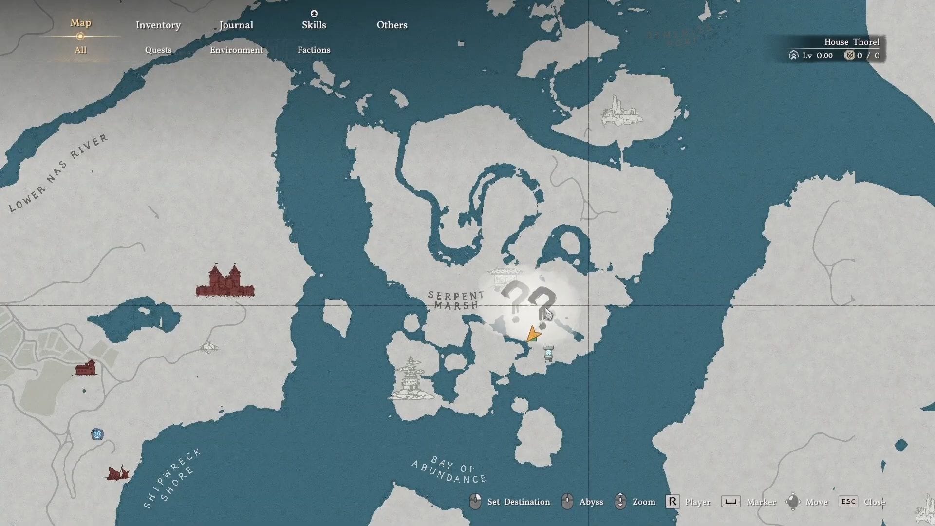 С учетом выполненных предварительных условий, отправляйтесь на болотистую местность Серпентина, которая расположена к югу от Деминиса, как показано на карте. Это место находится недалеко от точки быстрой телепортации, поэтому путь не будет слишком долгим, как только карта откроется. Ищите утес с многоцветным флагом рядом, как на изображении ниже. Это и есть нужный ориентир. Внутри пещеры также есть подобный флаг.