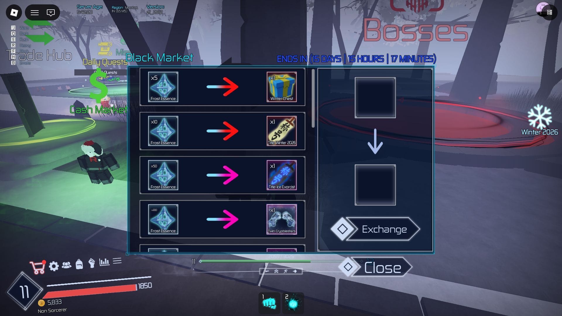 Jujutsu Infinite в данный момент проводит мероприятие Winter 2026, в рамках которого была введена новая валюты для обмена, специально предназначенная для данного события. Эта валюта называется Frost Essence, и её можно будет использовать на Чёрном Рынке для приобретения различных внутриигровых предметов. Поскольку она доступна только во время мероприятия Winter 2026, получить и использовать её можно лишь в период проведения события.