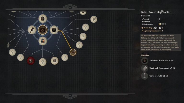 Для создания Ботинок Kuku Breeze-Step вам понадобятся 3x Электрических Компонента (добываемые у механических врагов) наряду с 1x Улучшенным Kuku Pot и Ядром Веры.