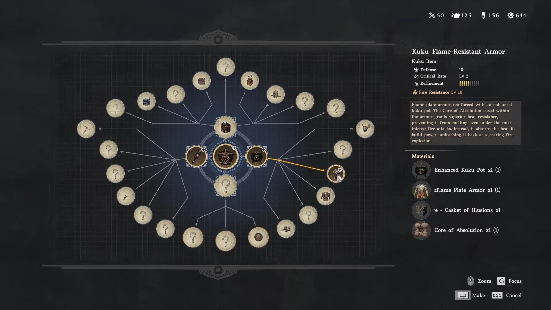 Собрав все четыре материала, вернитесь в мастерскую Гримнира, которая находится на юг от Хернанда, и создайте доспехи. Итогом станет доспехи Kuku Flame-Resistant Armor 5 уровня, со следующими характеристиками: