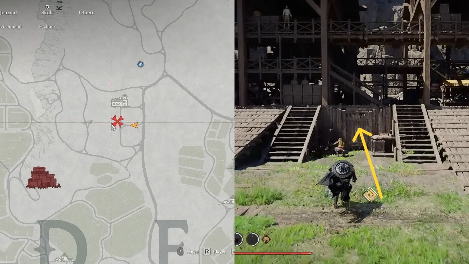 Эта деталь находится в сундучке с сокровищами на севере от Деминис, между D и E на карте, как показано выше. Направляйтесь в это место и ищите группу зданий с дверным проемом посередине. Присвойте себе crouch или пролезьте под ним, и сундучок будет прямо внутри.