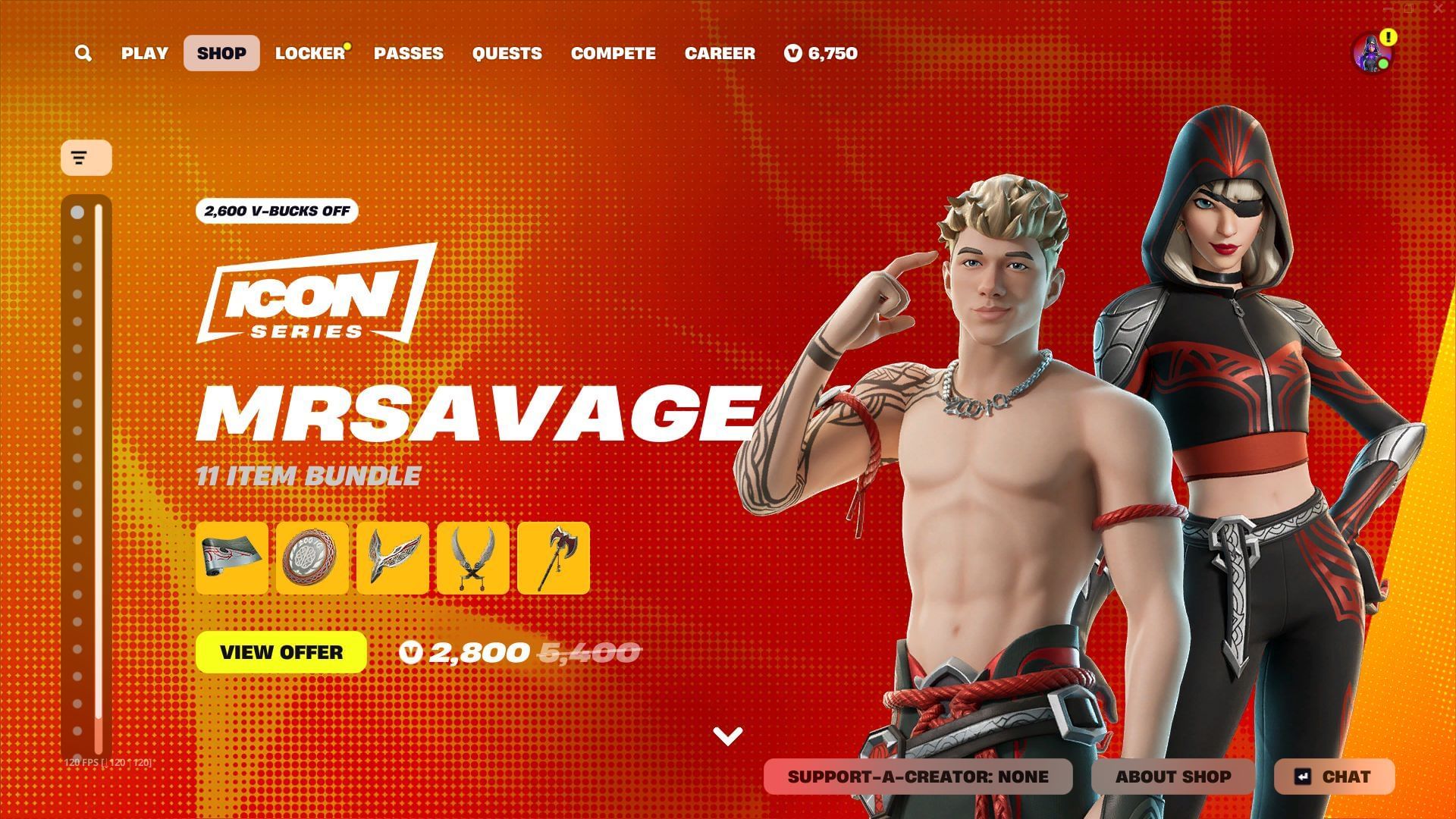 Если вы хотите получить все предметы из пакета MrSavage, вы можете приобрести их по сниженной цене 2,800 V-Bucks вместо обычных 5,400 V-Bucks или купить их по отдельности.