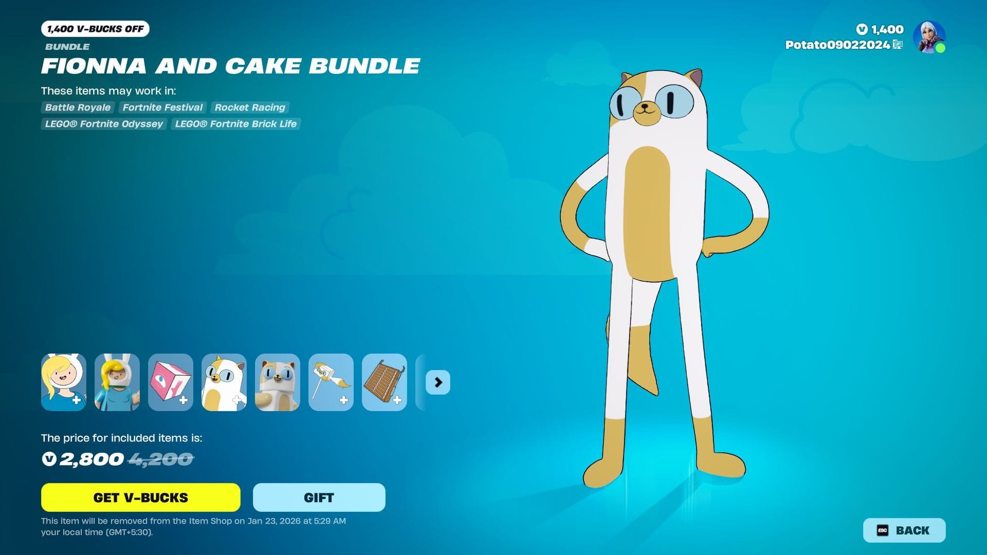 Если вы хотите приобрести все в пакете Fionna и Cake, вы можете купить его за 2,800 V-Bucks по скидке. Также вы можете купить все косметические предметы по отдельности, кроме Sledge Cake (Кирка). Кроме того, Hammered Dulcimer (Спина) можно приобрести отдельно за 300 V-Bucks.