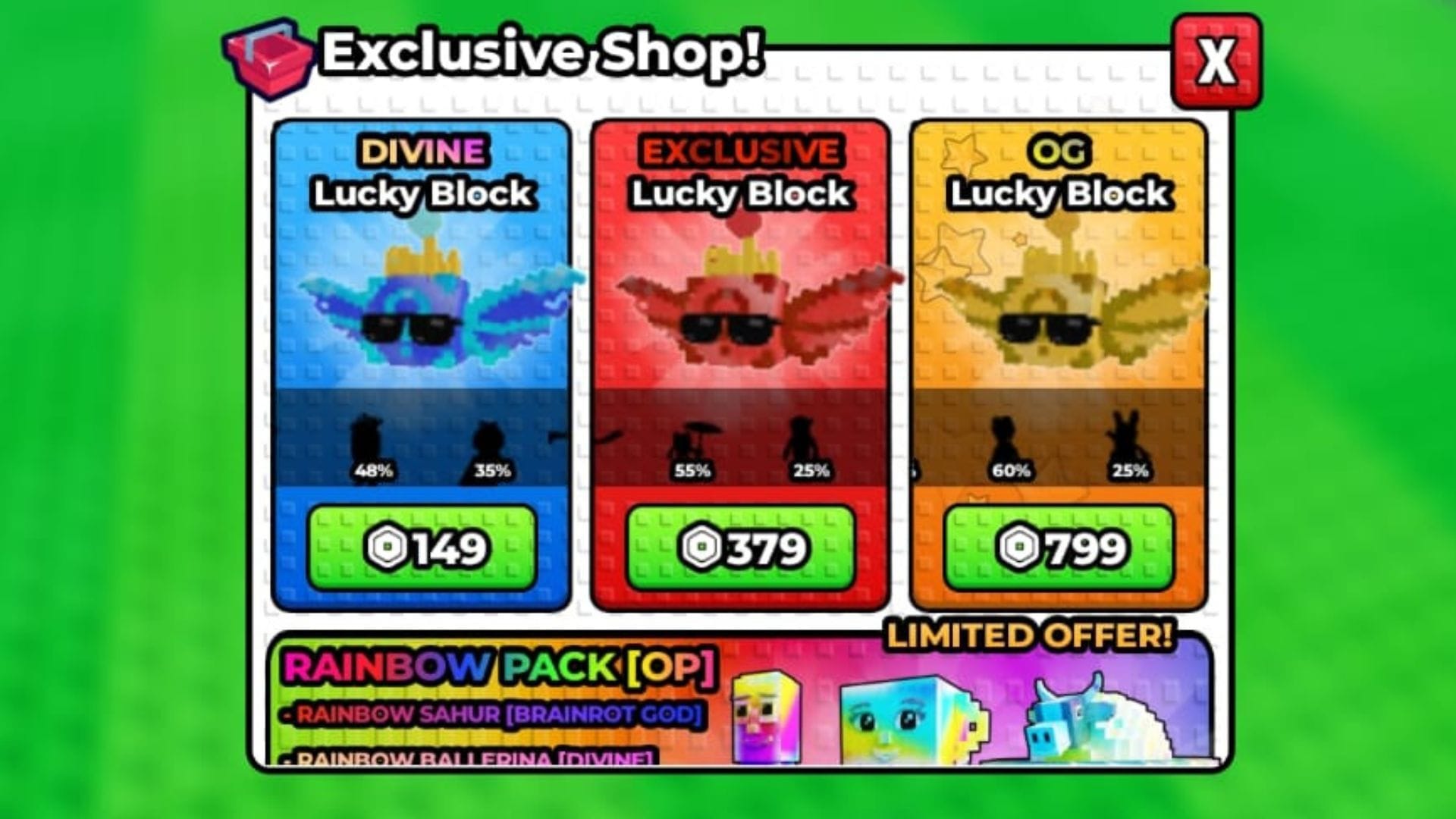 Вот все brainrots, а также их вероятность выпадения, которые можно получить из OG Lucky Block, купленного в магазине: