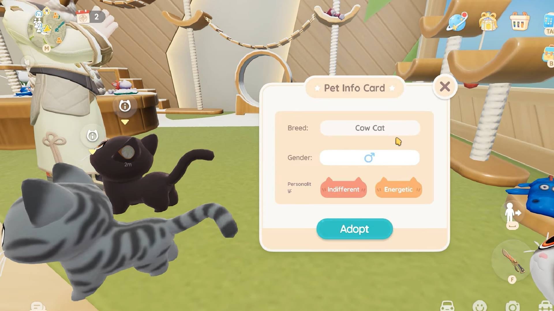 После завершения разговора выберите любую кошку и нажмите на иконку над ней. Это откроет Карту информации о питомце, где вы сможете ознакомиться с типом породы, характером и полом кошек. После выбора нажмите на “Усыновить”, чтобы сделать кошку своим питомцем. Это также мгновенно переведёт вашего выбранного питомца к вам домой.