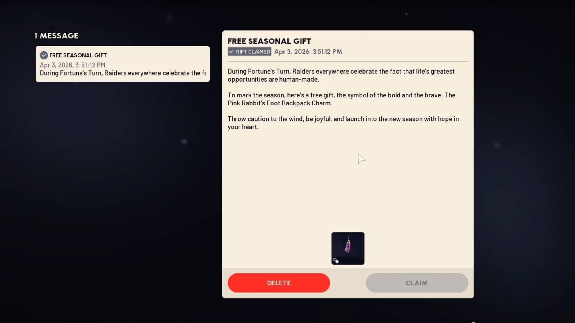 Вы можете получить амулет Розовой Кроличьей Лапки бесплатно в ARC Raiders, просто войдя в игру. Вам необходимо войти в игру в выходные праздники Пасхи, которые начались 3 апреля 2026. После входа просто перейдите во вкладку входящих сообщений, расположенную в правом верхнем углу главного меню. Там вы найдете сообщение от разработчиков с текстом “Бесплатный сезонный подарок.“