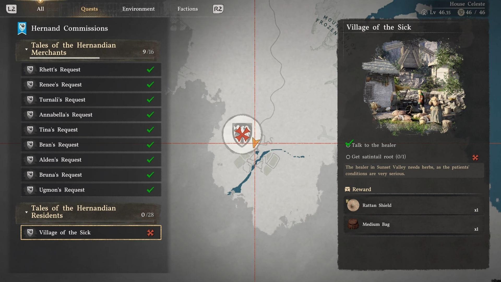 Когда у вас будет корень, взаимодействуйте с Фрейдис и передайте ей корень Сатинтейл в Crimson Desert. Целитель начнёт готовить лекарство для исцеления Деревни больных. Завершение квеста наградит вас средней сумкой, которая откроет три дополнительных слота в инвентаре.