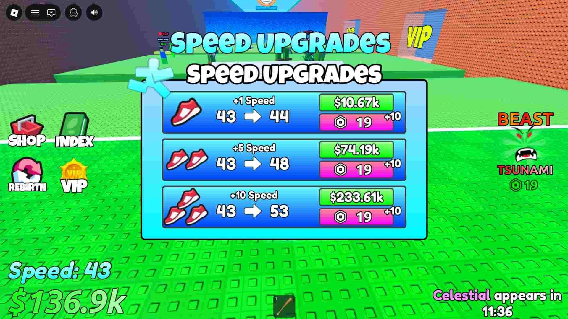 Кроме того, вам нужна скорость для использования функции Rebirth в Escape Tsunami For Brainrots. Для Rebirth 1 необходимо накопить 40 Speed, для Rebirth 2 — 50, и по +10 для каждого следующего Rebirth.