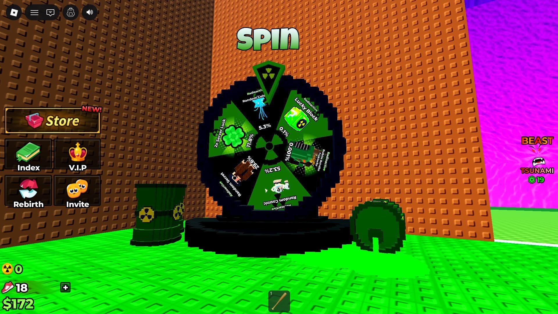 Что касается Радиоактивных Удачных Блоков, их можно получить с 1% шансом из Радиоактивного Колеса Спинов. Спины проводятся на Колесе с использованием Радиоактивных Монет, которые появляются исключительно во время часового Радиоактивного События.