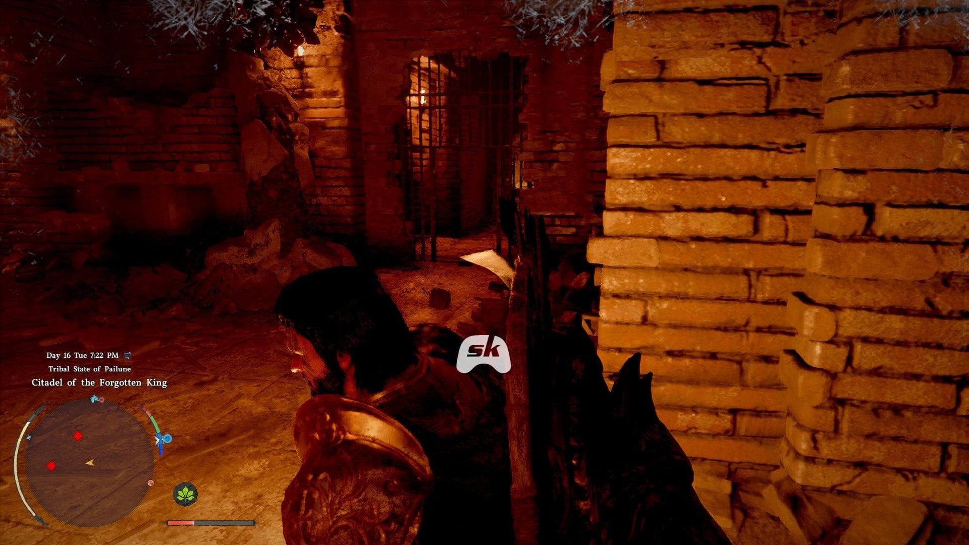 После входа в руины вы наткнетесь на коридор, заполненный шипами. Преодолеть его довольно просто, так как вы можете цепляться за стены и передвигаться по коридору.