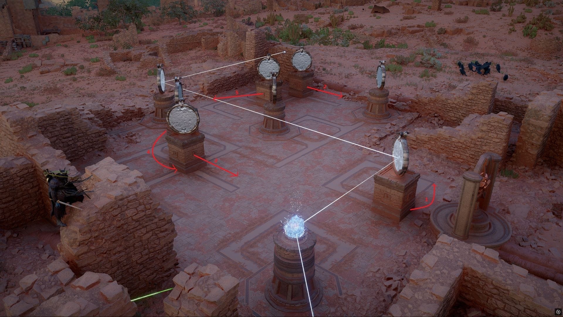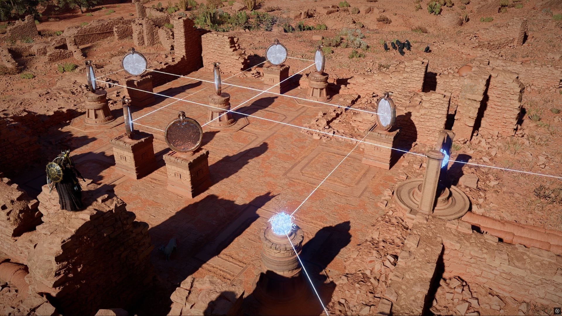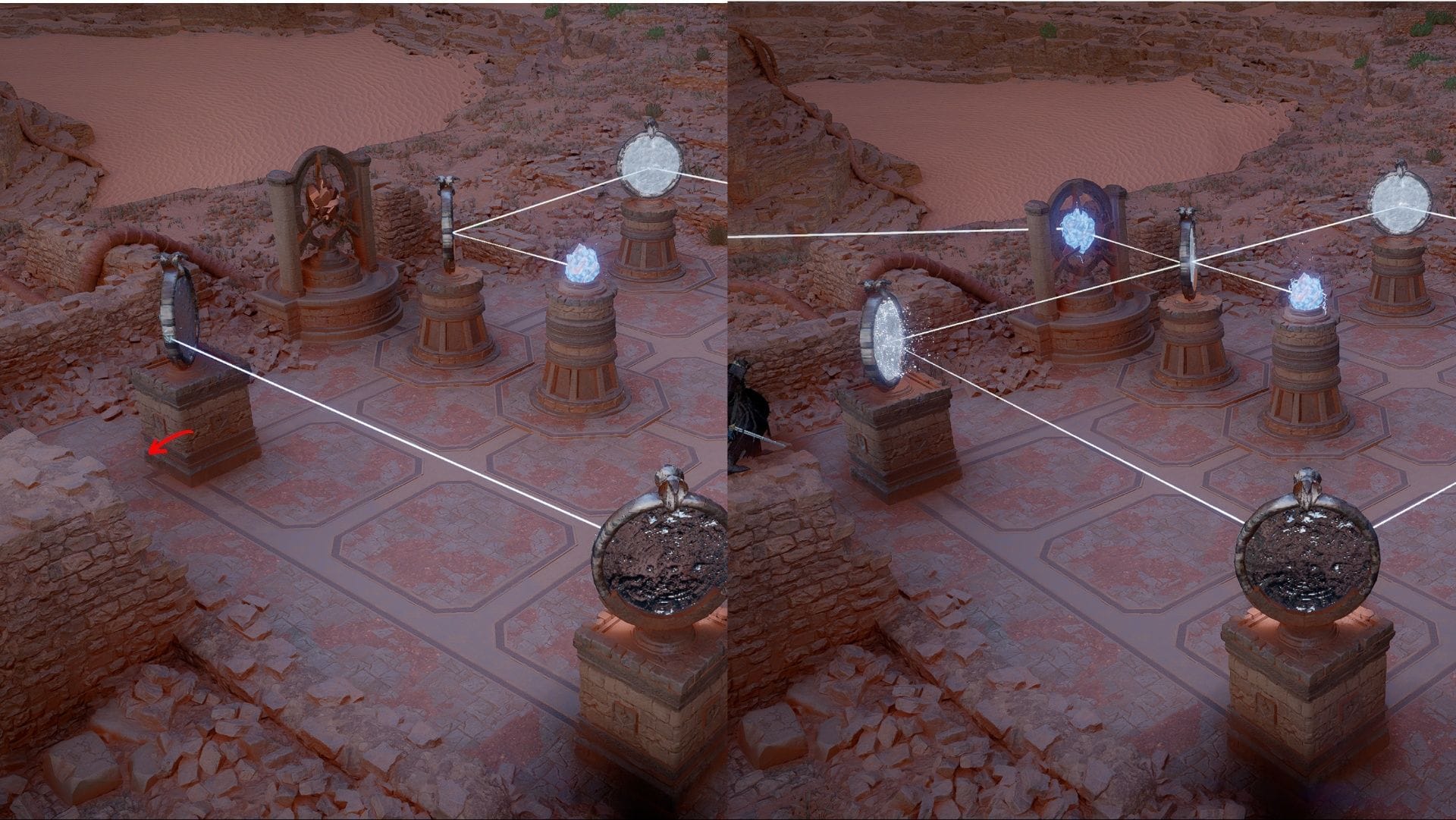 Когда вы достигнете башни, двигайтесь в восточном направлении, где вы найдете некоторые столбы с круглыми зеркалами, отражающими луч света. Первая секция очень простая. Вам нужно всего лишь немного передвинуть последний столб, чтобы отклонить свет, который затем будет отражен через кристалл и перейдет к следующей секции.