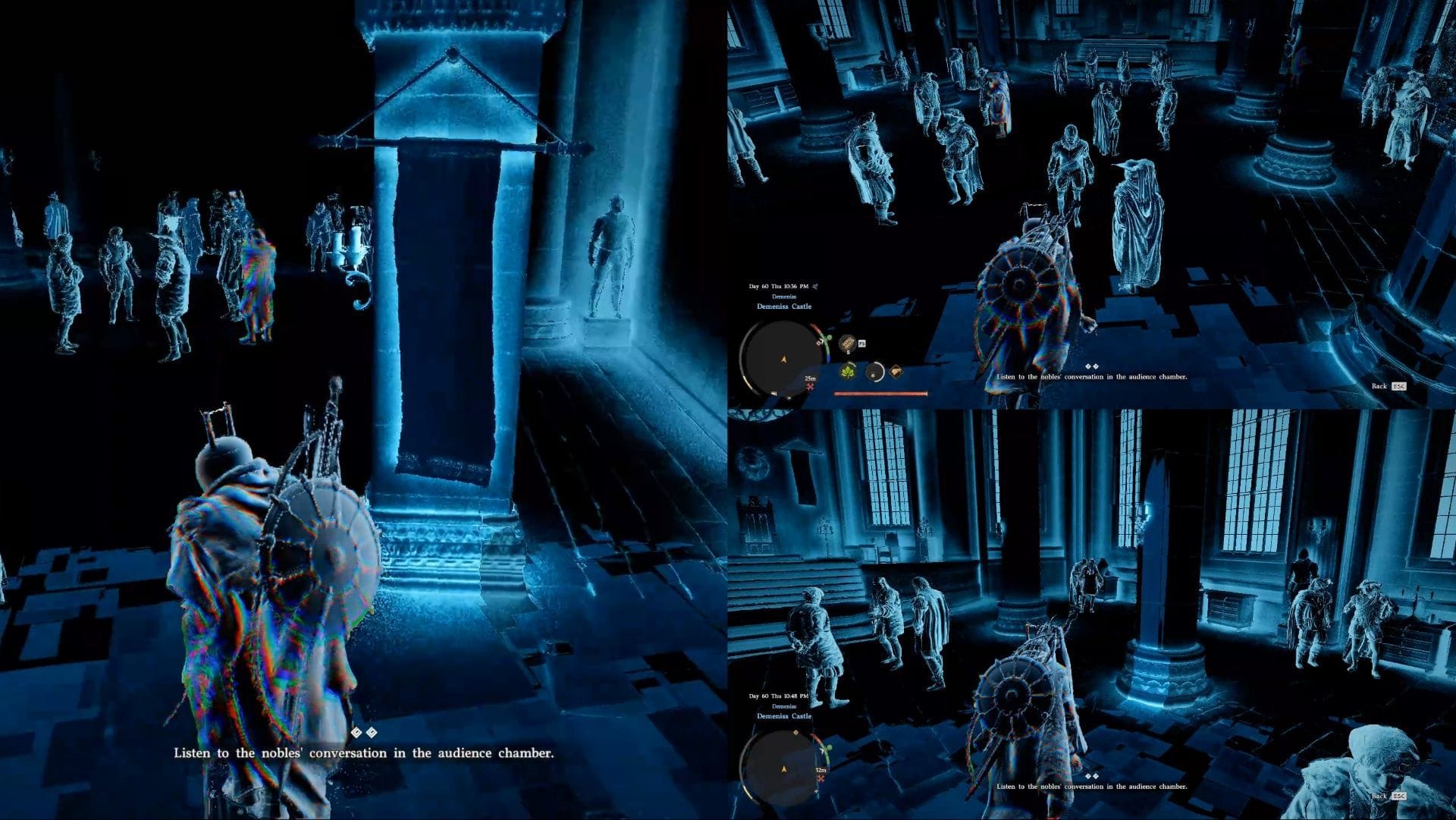 Снова не снимайте шлем и строго оставайтесь в царстве памяти. Как только вы окажетесь в зале, повернитесь вправо, и вы увидите первого аристократа, разговор которого вам нужно послушать.