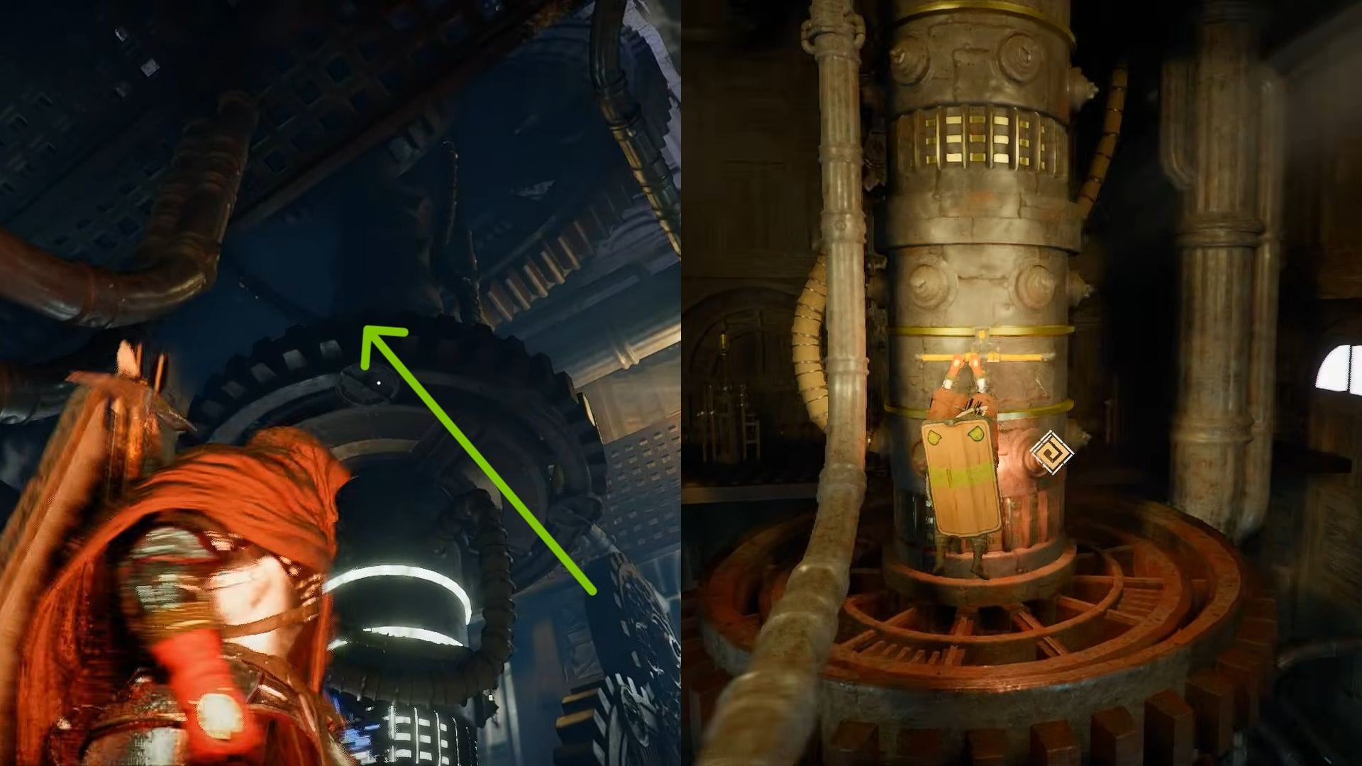 Попав внутрь, сразу же обратите внимание на жёлтый рычаг, расположенный прямо перед вами. Прыгните к нему, прицеливайтесь в центр и опустите его. Это активирует первый набор механизмов в башне. Рычаг может быть немного сложным для захвата, поэтому лучше правильно выстроить прыжок на середину, чтобы избежать ненужных повторений.