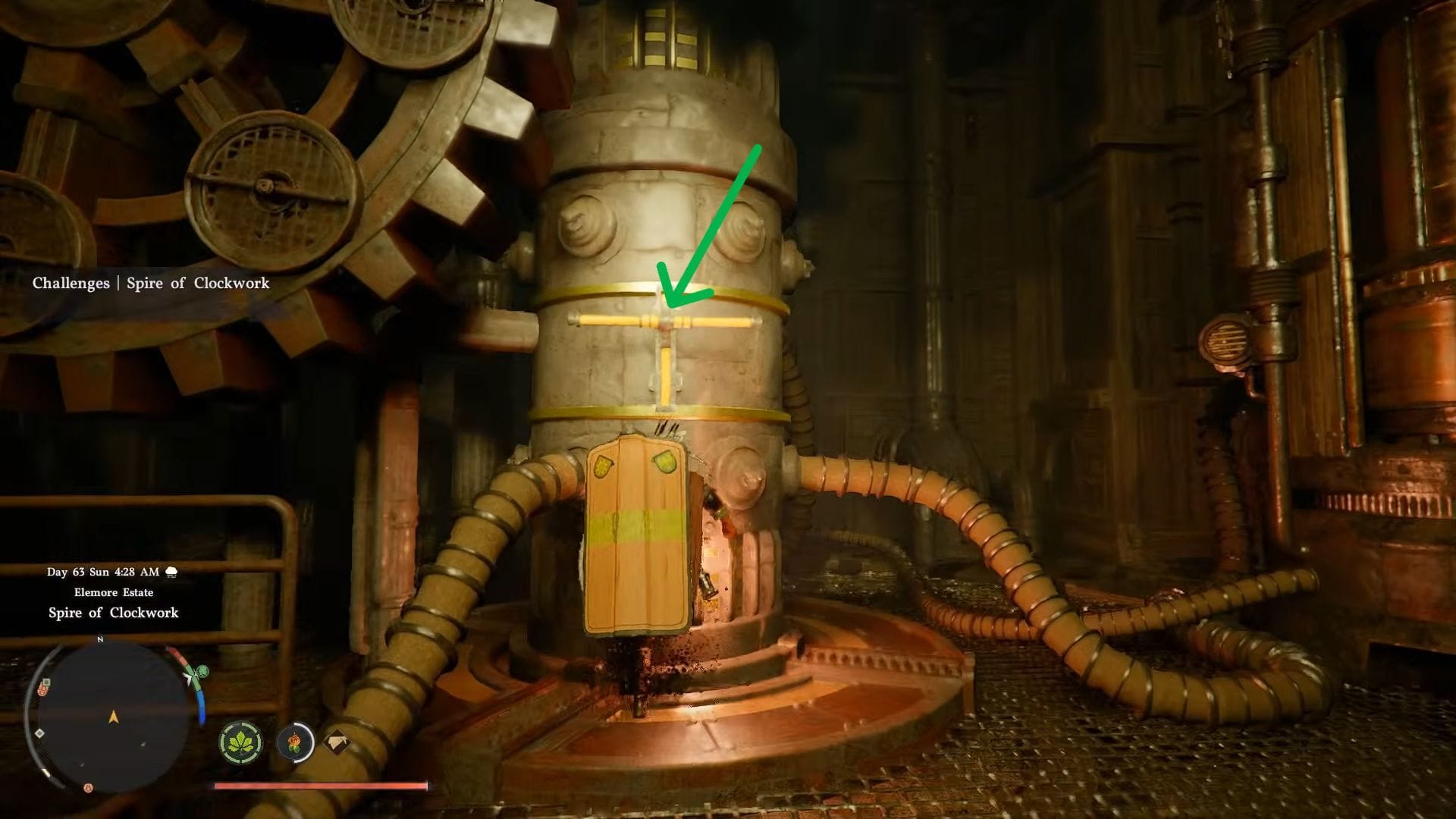 Загадка Spire of Clockwork расположена на северо-востоке Деминиса, рядом с Breezeblown Knoll. Входная дверь башни заблокирована, и открывается лишь после завершения главы 8 основной сюжетной линии, озаглавленной A Fleeting Dream. Среди наград за прохождение этой главы вы получите Ключ от Spire of Clockwork, который разблокирует дверь у основания лестницы.