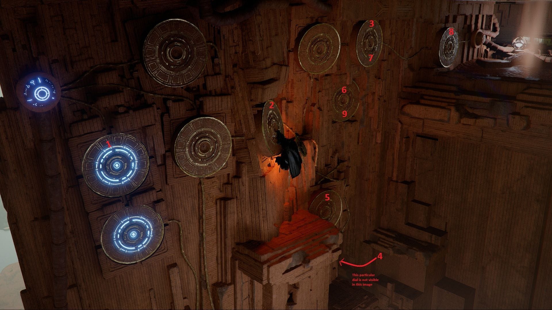 Пройдите через открытие и отправляйтесь под платформу. Поверните направо и двигайтесь вперёд. Здесь вы найдете несколько кольцевых переключателей. Вам нужно будет завершить три отдельных секции, нажимая на переключатели в точном порядке, чтобы активировать их.