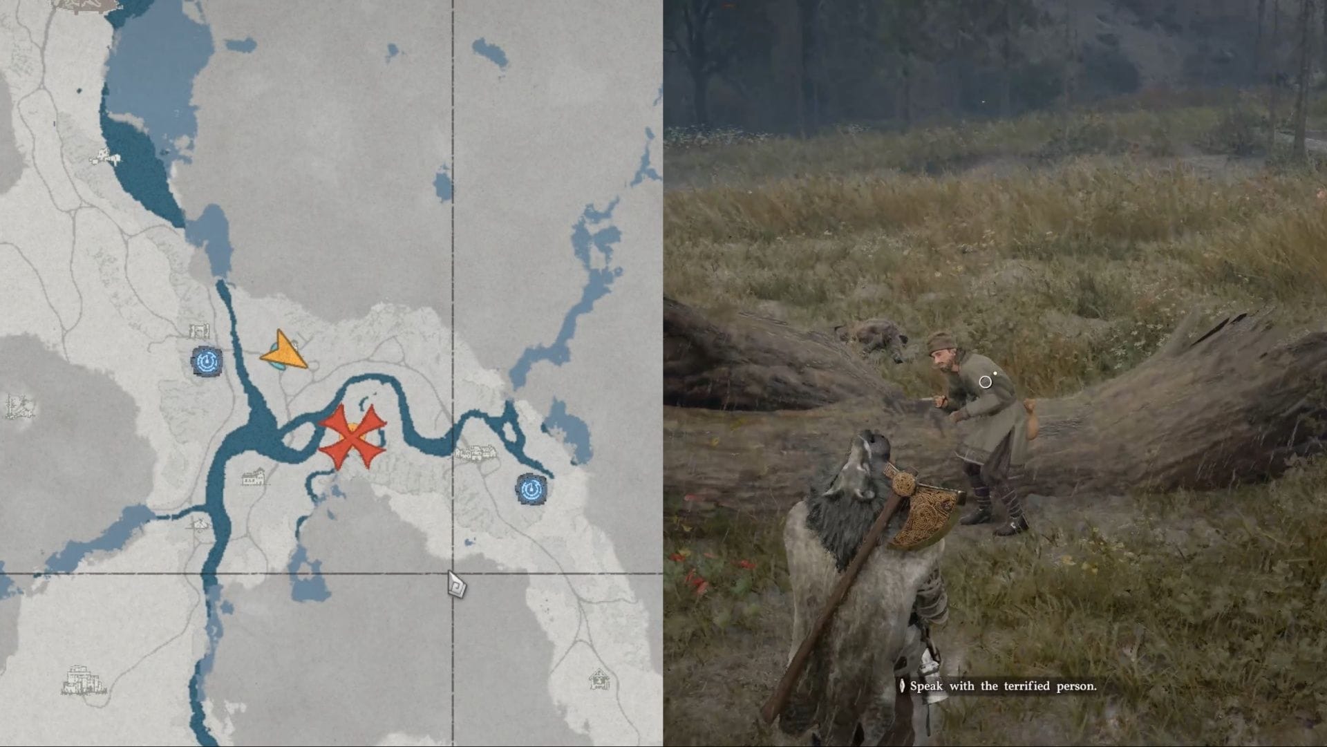 Когда вы достигнете отмеченной локации, вы встретите напуганного человека. Поговорите с ним, и он расскажет, что Ящеры атаковали это место. Теперь вам нужно отследить, куда они ушли.