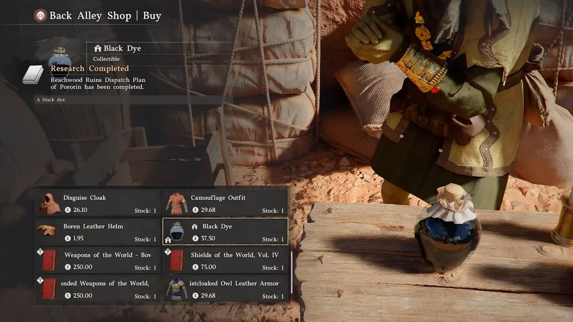 После завершения квеста вернитесь в деревню Муйкун и подождите немного. Это приведет к появлению продавца из магазинчика за углом города, рядом с железной дорогой, который предложит вам различные товары, включая настоящий черный краситель за 37.50 серебра.