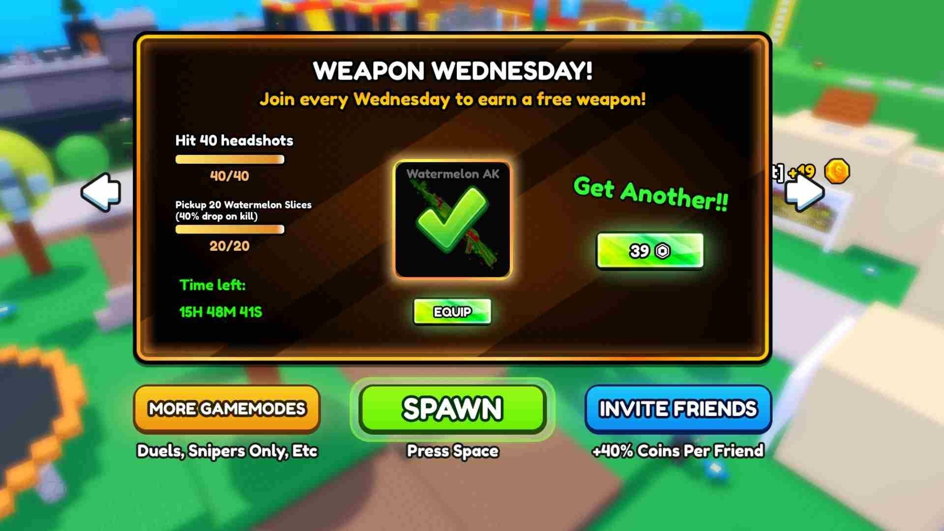 При входе и достижении главного меню на экране появится окно события. Слева вы увидите две задачи, которые необходимо выполнить, а также таймер, показывающий, как долго будет проходить текущее событие. В центре размещена информация о неделе — возможной награде. Вы также найдете опцию потратить 39 Robux на получение еще одного оружия или скина.