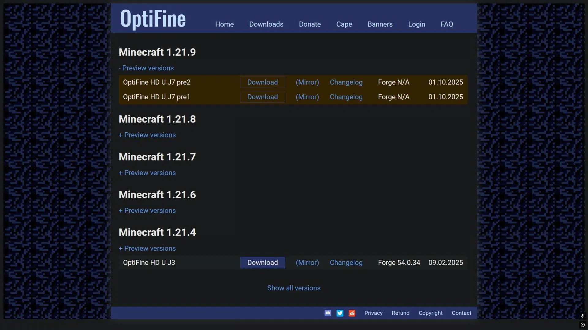 OptiFine является модом для повышения производительности, который можно прямо скачать с их официального сайта. Когда игроки посещают этот сайт и выбирают вкладку “Загрузки”, они заметят несколько предварительных версий для различных предыдущих обновлений игры. Единственная стабильная версия мода, доступная на сайте, предназначена для Minecraft 1.21.4, обновления The Garden Awakens.