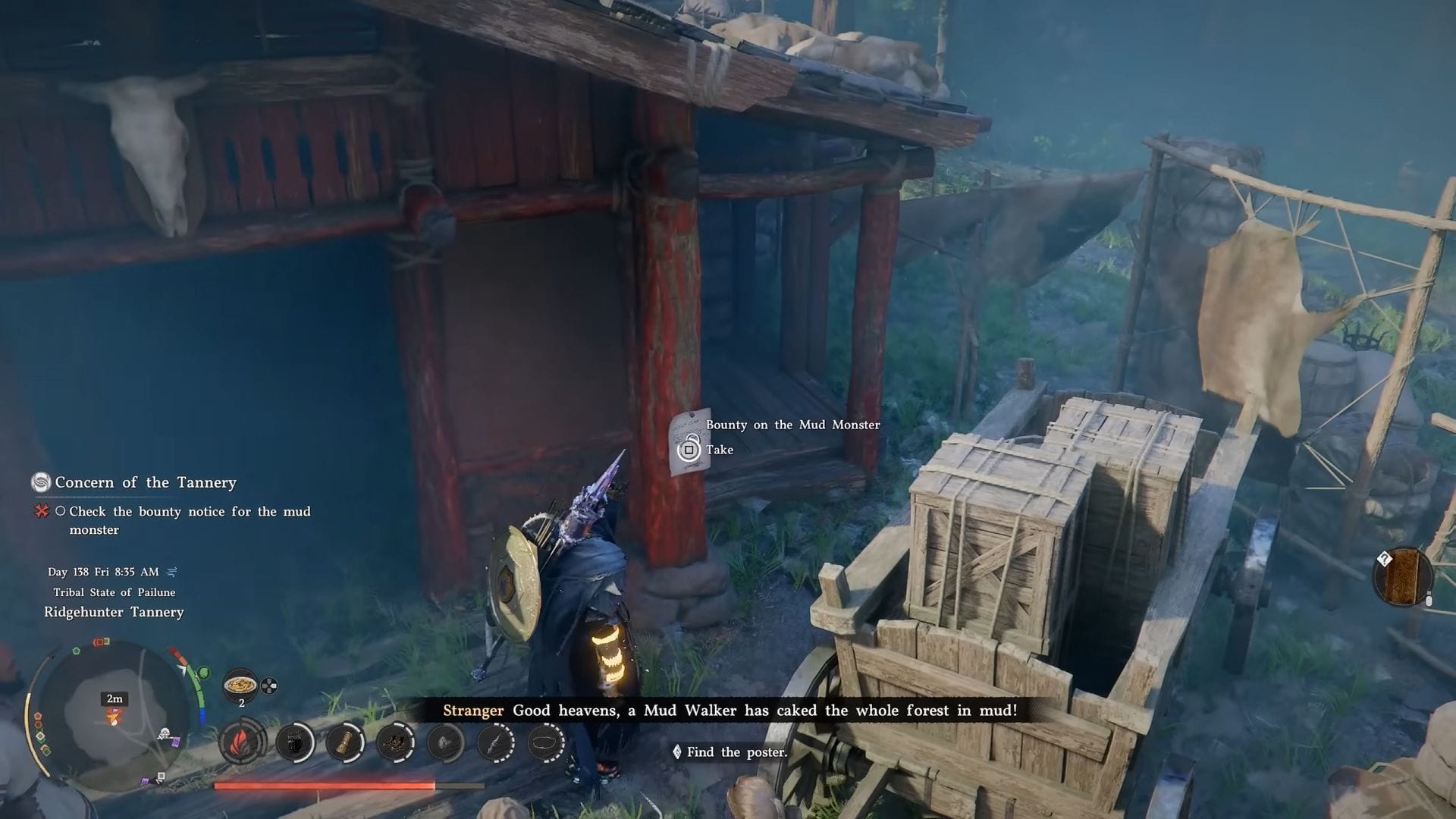 Затем перейдите в раздел племени Longleaf в вашем Журнале и начните задание Concern of the Tannery. Когда вы доберетесь до места, показанного на изображении выше во время задания, возьмите уведомление о награде с пилона. Это даст вам задание “Охотник за спортивными трофеями”.
