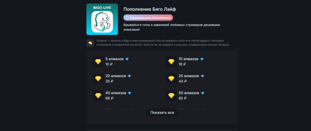 На Donatov.net пополнение Bigo Live построено максимально просто: вы выбираете нужный набор, вводите ID аккаунта, оплачиваете — и через несколько минут алмазы приходят на ваш профиль. Причём можно купить даже совсем небольшой объём (от 5 алмазов) — удобно, если вы хотите протестировать процесс или пополняться “по ситуации”, а не на крупные суммы.