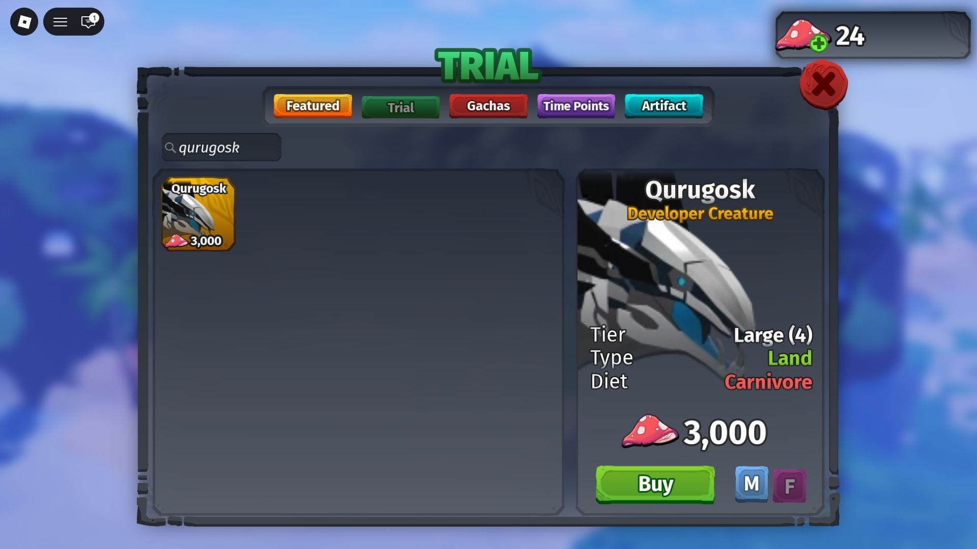 Qurugosk можно купить за 399 Robux в Магазине Существ Разработчика или получить на пробный период в Магазине Пробных Существ.