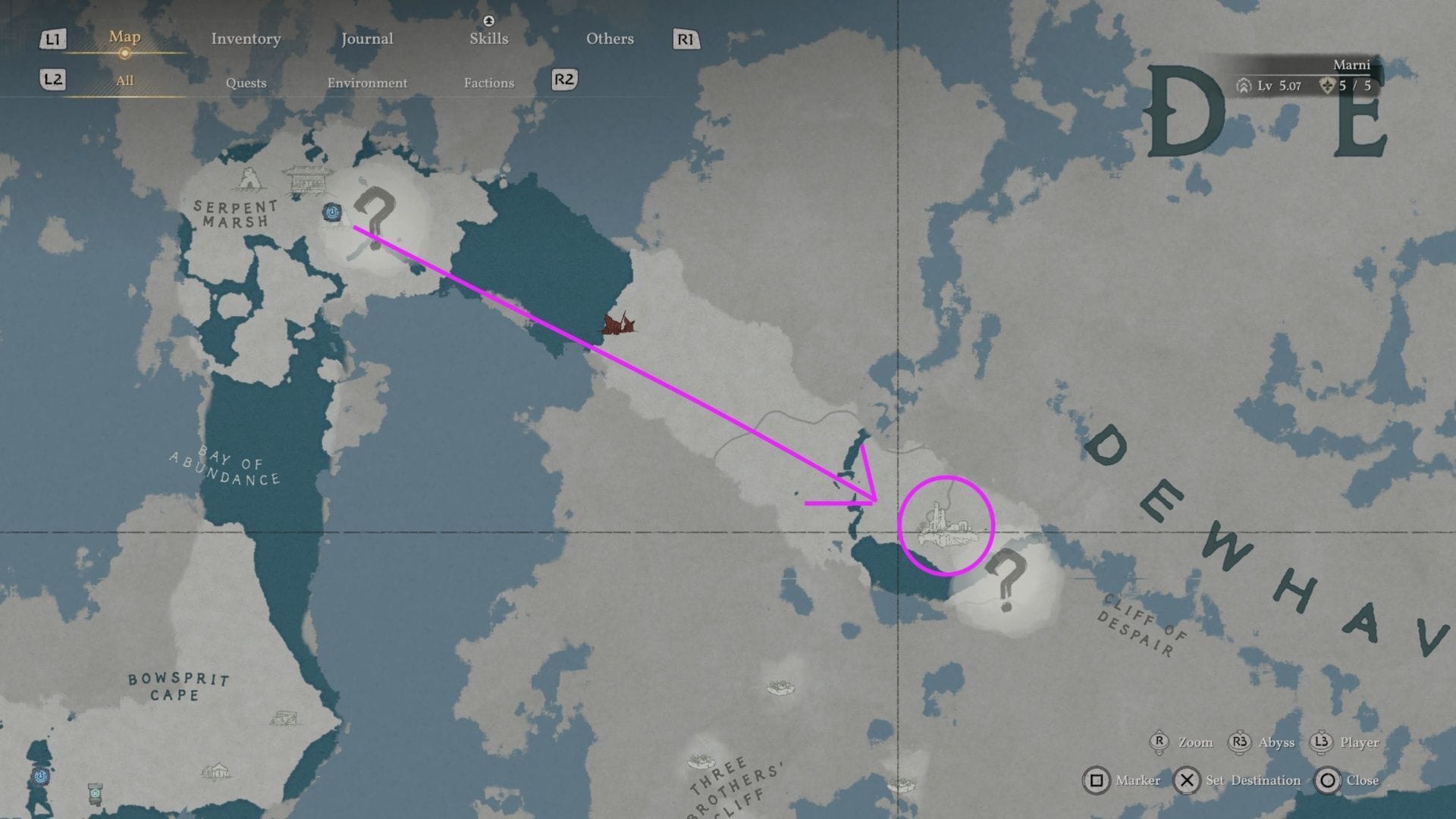 После того как вы встретите Ведьму Смирения, вы сможете начать Святилище Преданности в Crimson Desert. На карте вы увидите его местонахождение, оно расположено рядом с Утёсом Отчаяния в Dewhaven. У меня не было точки быстрого перемещения здесь, поэтому мне пришлось самостоятельно добираться от Ведьмы Смирения через воду к Утёсу Отчаяния.
