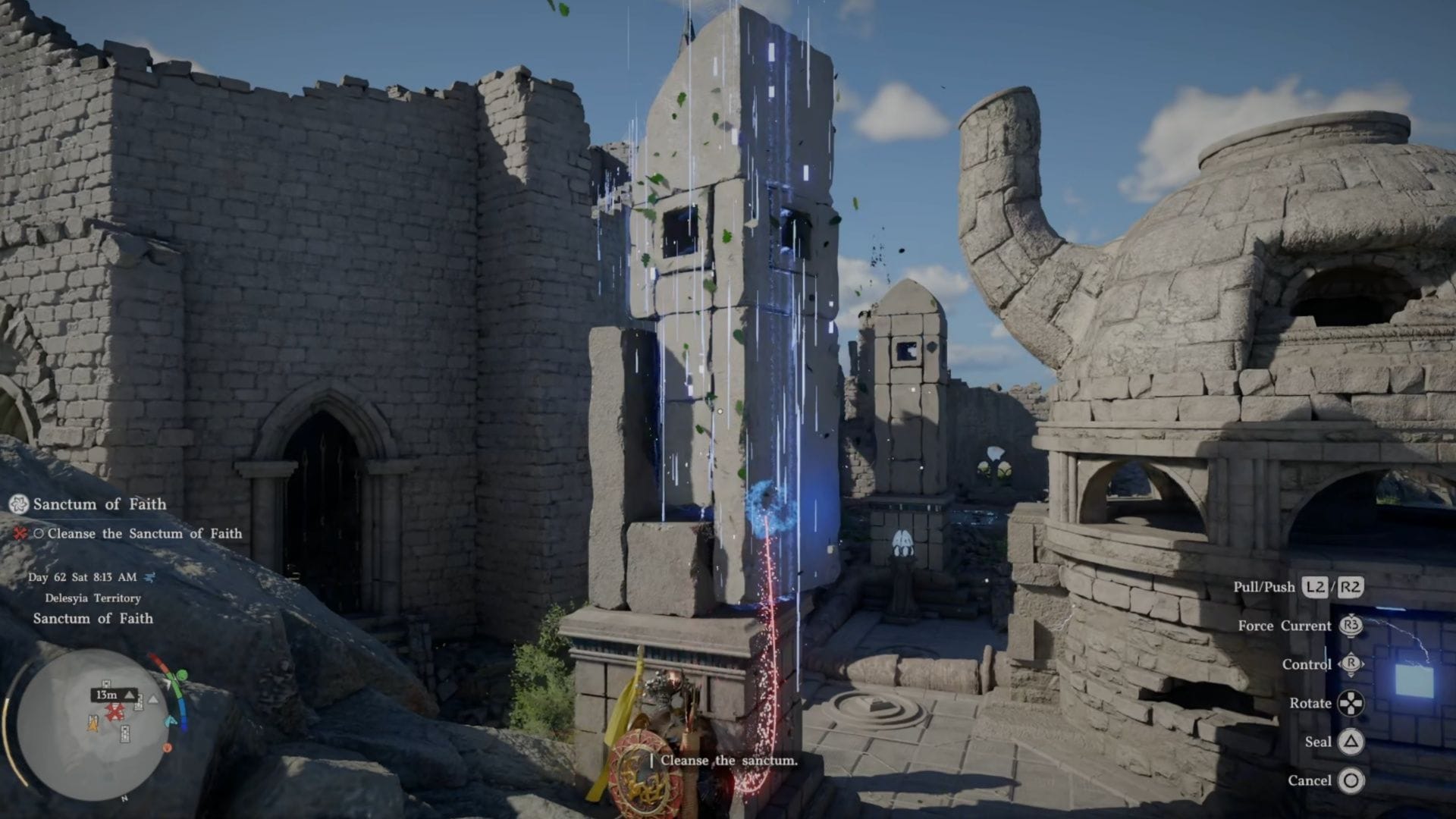 Теперь, когда это урегулировано, направляйтесь в область с головоломкой, заберите свой Fusion Core и с помощью Force Palm вставьте его в единственное доступное пустое место. Затем возьмите Fusion Reactor и выравните его на сломанной колонне, как показано на изображении выше. Когда вы увидите закручивающиеся листья, значит, оно готово. Заберитесь наверх, прыгните и с помощью Force Palm зафиксируйте его на месте. Это все, что вам нужно сделать, и Sanctum of Faith завершен в Crimson Desert!