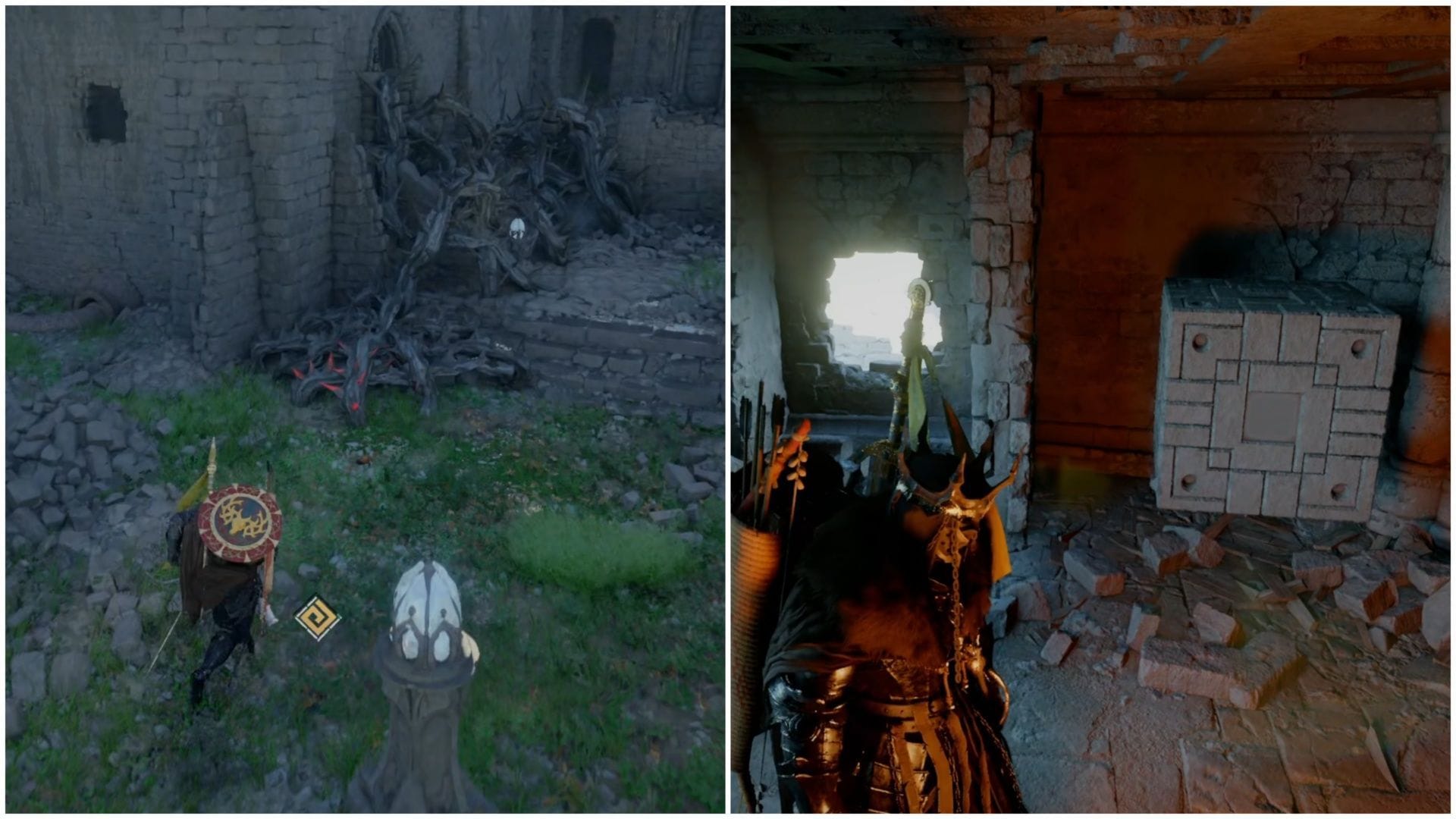 Вы увидите дверной проем, покрытый огромным слоем мха и лоз. Подожгите их с помощью Blinding Flash, и когда они исчезнут, вы сможете подобрать сундук с сокровищами, содержащий Ancient Shield, который обладает Defense 3 из сета Abyss Gear и Guard Stamina Cost -3.0% из аналогичного сета.