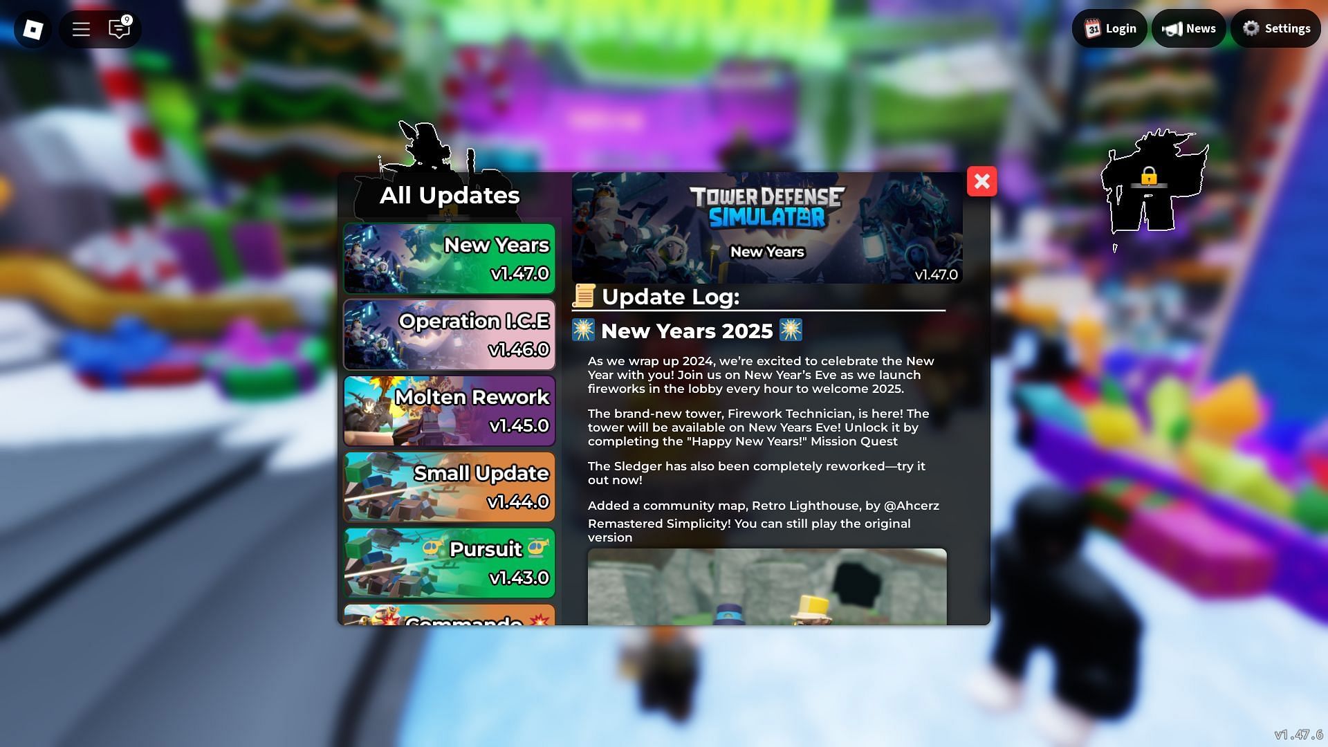 Tower Defense Simulator предлагает вам разместить юниты на поле, чтобы защититься от продвигающихся врагов и защитить ваш домашний базис. С появлением Нового года игра представила новый набор миссий, состоящий из пяти целей, названный Happy New Years Quest (квест Счастливого Нового года). Завершение этого набора целей дает вам эксклюзивные награды в виде монет, опыта и новой башни.