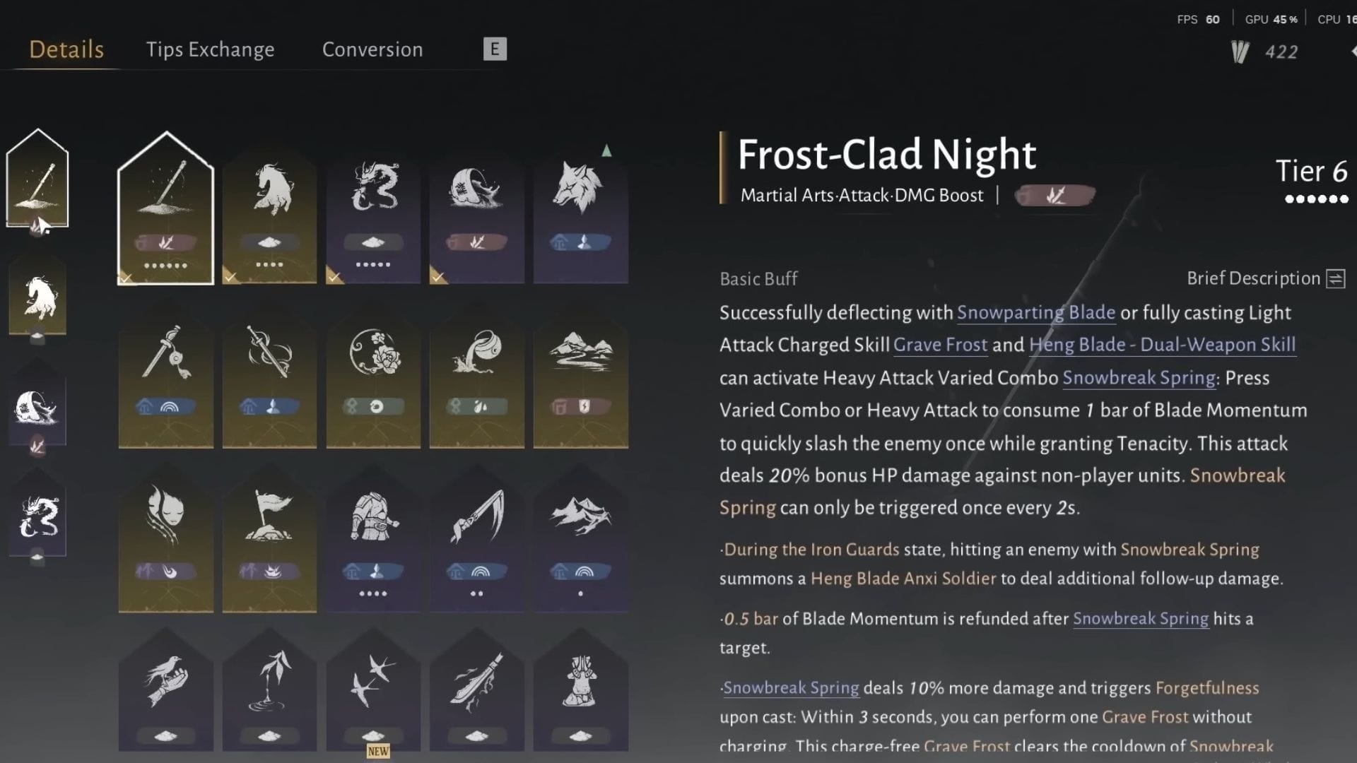 - “Успешное отражение с помощью Льдоразделяющего Меча или полное использование Заклинания Легкой Атаки Усиленного Льда и Меча Хэн – Двума Оружийными Умениями может активировать Сложный Комбо Массированной Атаки Находка Весны: нажмите Сложный Комбо или Массированную Атаку, чтобы потратить 1 подобранную единицу Движения Меча и быстро ударить врага, обеспечив Пристальность. Эта атака наносит 20% дополнительного урона по здоровью противником, не являющимся игроком. Находка Весны может быть активирована раз в 2 секунды.”