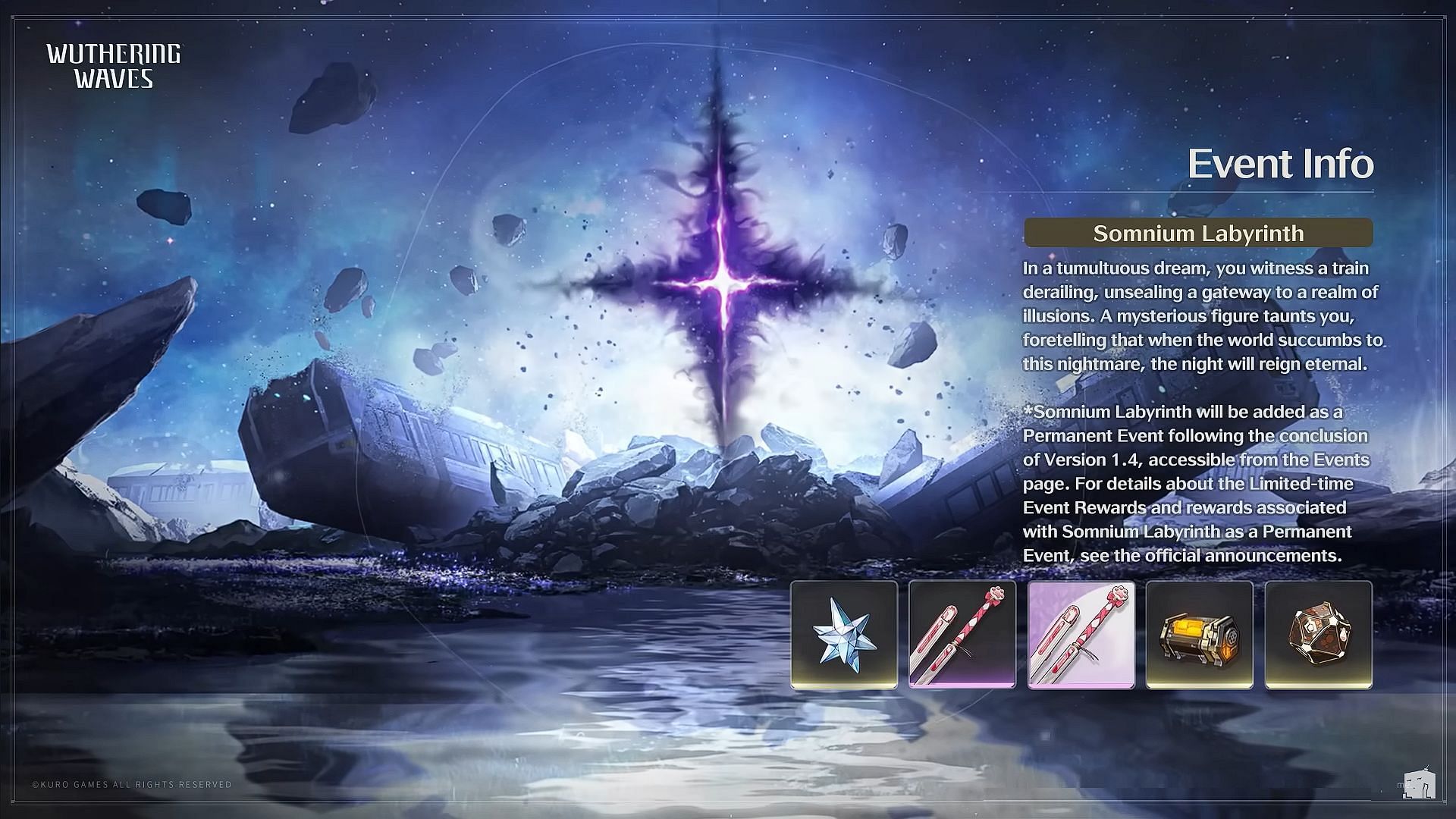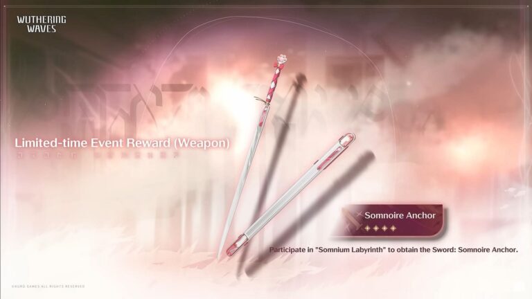 Вы можете получить новый 4-звездочный меч, Somnoire Anchor, участвуя в новом событии Somnium Labyrinth в обновлении Wuthering Waves 1.4. Разработчики подтвердили, что это событие станет постоянным и будет доступно даже после версии 1.4. Однако событийное оружие доступно ограниченное время, поэтому оно будет доступно только в версии 1.4.